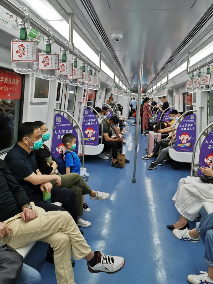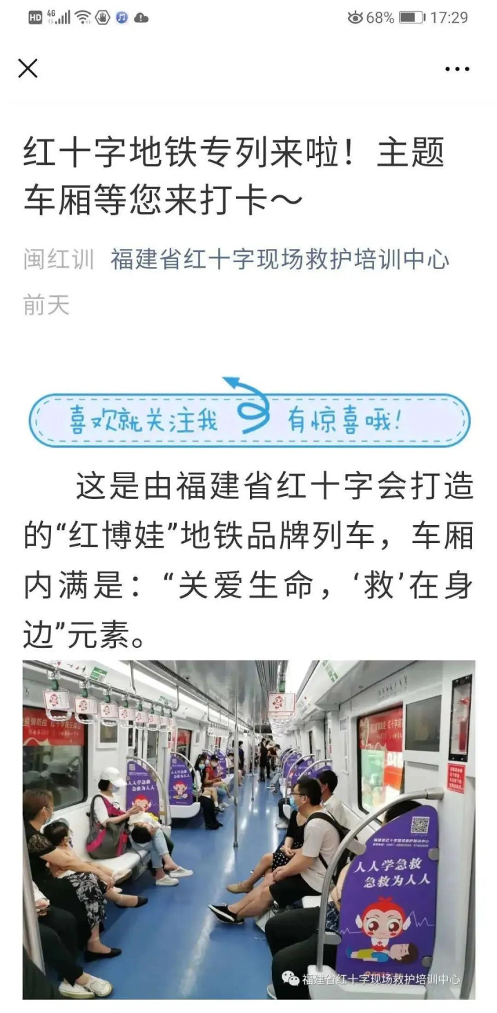 省红十字现场救护培训中心依托地铁“品牌列车”主题宣传活动,开展乘坐地铁与“红博娃”合影、打卡集赞活动,仅半天时间就吸引1000多名乘客参加。