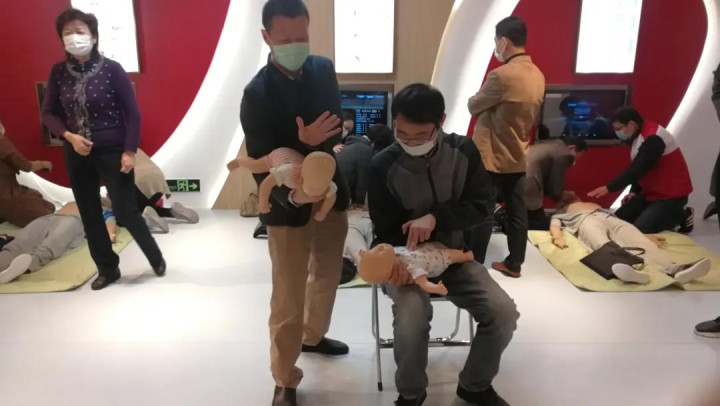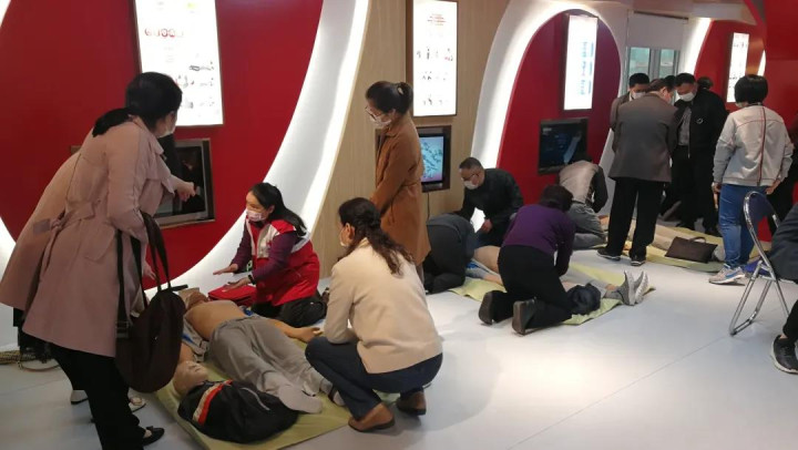 参训学员们参观了应急救护培训基地内的红十字文化传播区和文化长廊,在地震自救、烟雾逃生、绳结体验、家庭安全、厨房防火、模拟驾驶、公交车逃生等功能模块中学习灾害避险、火灾逃生、家庭安全等应急救护技能,同时,还认真学习练习心肺复苏术、自动体外除颤仪(AED机)使用、气道梗阻解除海姆立克法及止血包扎技术。