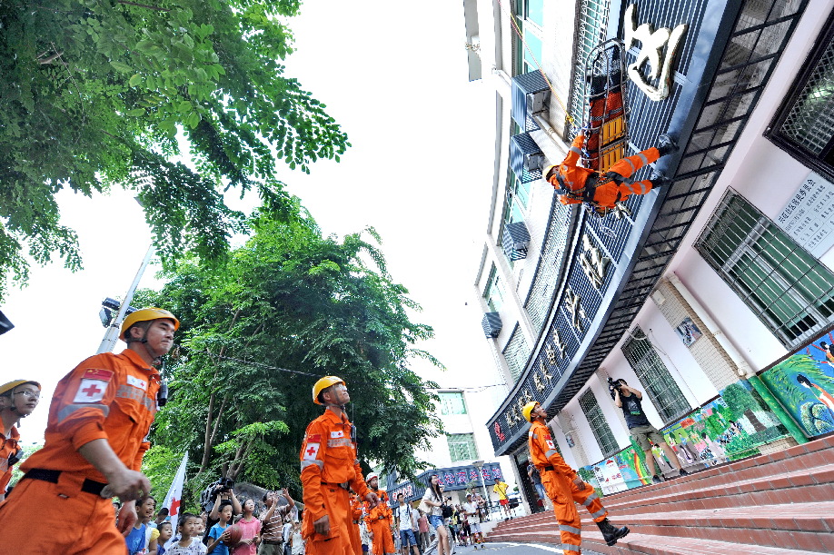 9月13日,厦门红十字会北极星救援队的志愿者们用担架绳索把重伤员从楼顶安全转移到地面。