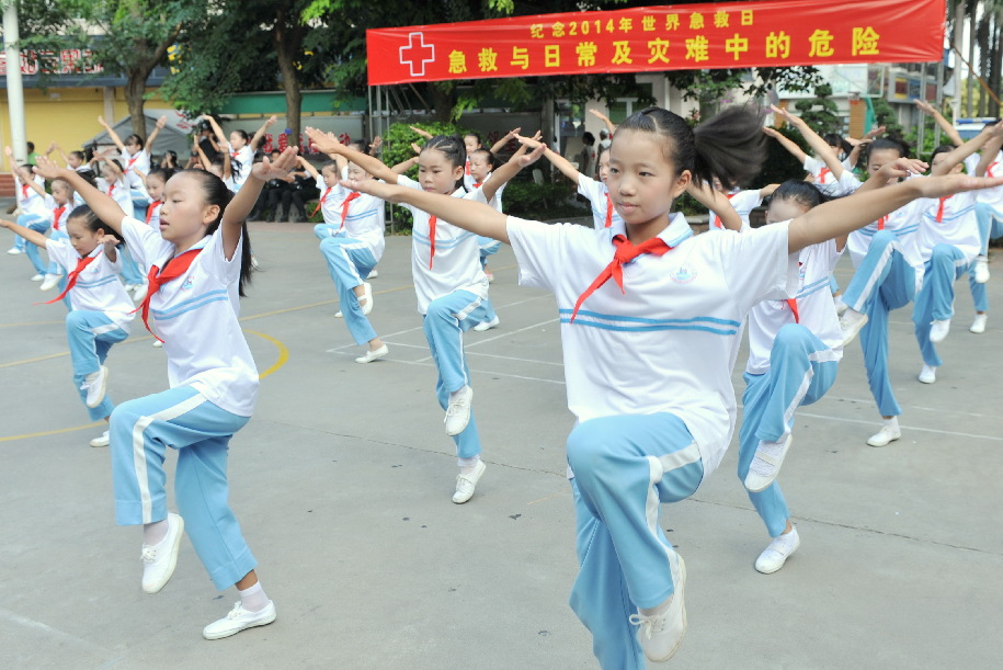 9月13日,厦门市集美乐海小学的红十字青少年在表演急救技能与生命安全健身操。