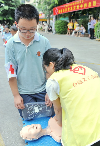 9月13日,志工和厦门一中海沧分校学生在演示急救技能。