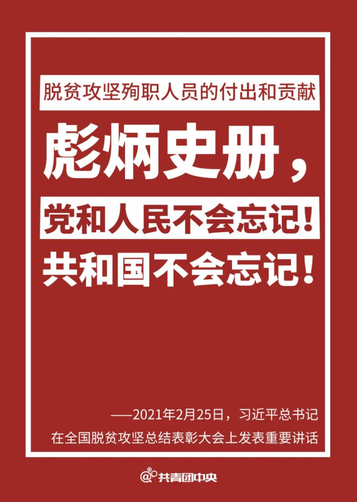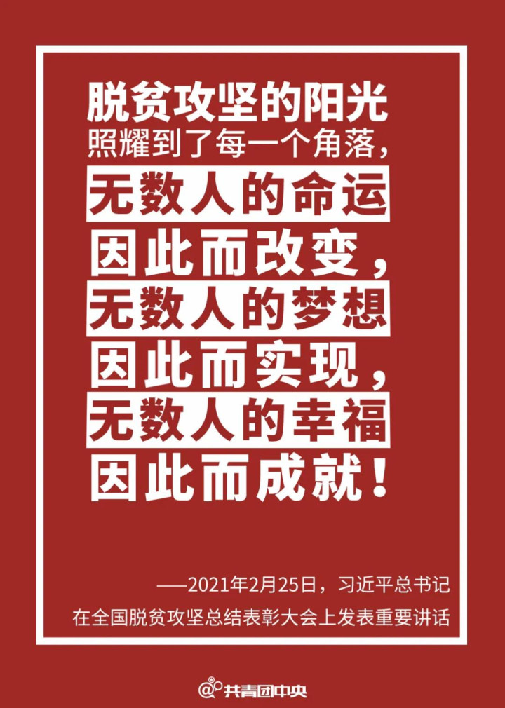 会上,习近平总书记庄严宣告:经过全党全国各族人民共同努力,在迎来中国共产党成立一百周年的重要时刻,我国脱贫攻坚战取得全面胜利,现行标准下9899万农村贫困人口全部脱贫,832个贫困县全部摘帽,12.8万个贫困村全部出列,区域性整体贫困得到解决,完成了消除绝对贫困的艰巨任务,创造了又一个彪炳史册的人间奇迹!这是中国人民的伟大光荣,是中国共产党的伟大光荣,是中华民族的伟大光荣!