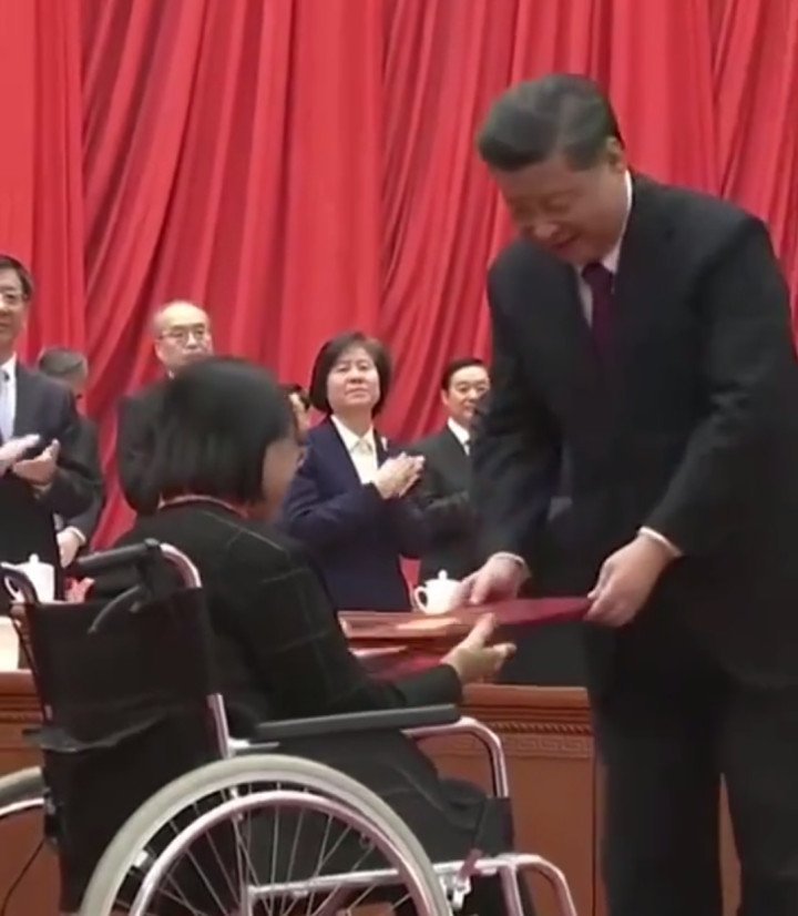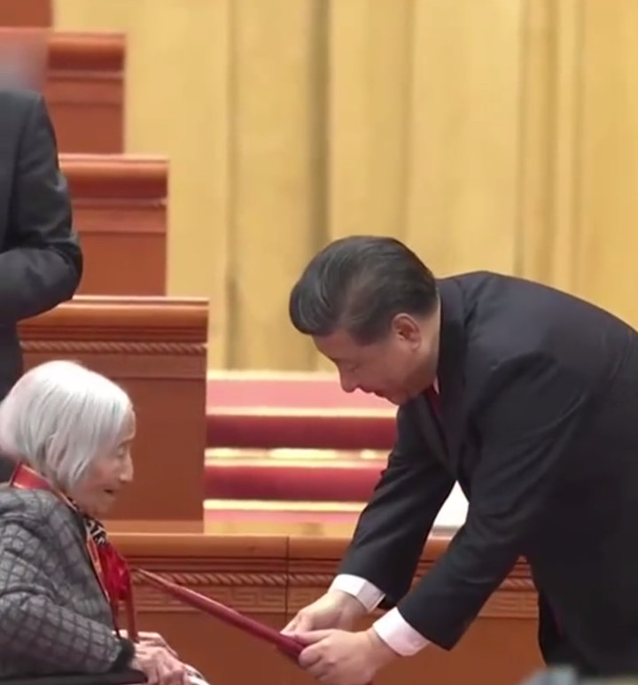 颁奖时,98岁的夏森老人屡次欲从轮椅上起身,总书记弯腰颁授证书。