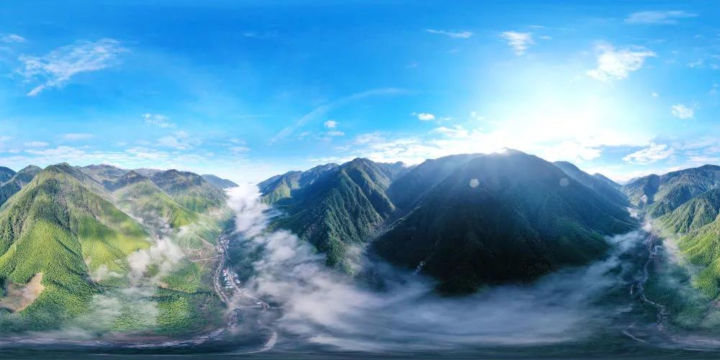 2020年12月1日,武夷断裂带峡谷内云雾缭绕,村庄若隐若现(无人机拼接照片)。新华社记者姜克红摄