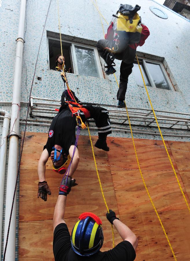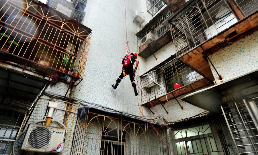 6月16日,一名台湾红十字救灾队队员在进行绳降演练。当日,海峡两岸红十字居家照护与防灾救援协同演练在厦门市思明区筼筜街道育秀社区举行。活动旨在借鉴台湾红十字组织在居家照护方面较为成熟的技能培训方法,推动红十字组织在居家养老事业方面发挥独特作用。新华社记者魏培全摄