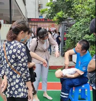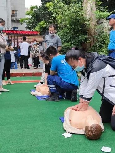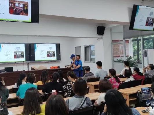 红十字曙光救援大队教员蔡志勇、陈平讲解心肺复苏术、AED操作与使用和气道异物梗阻急救方法。