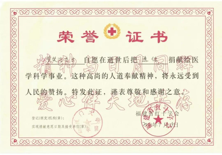 7月19日下午约4点30分,黄笑治老人因病医治无效在泉州市光前医院离世。按照她生前的遗愿,家人将她的遗体无偿捐给厦门大学医学院,将眼角膜捐给2名等待眼角膜移植的眼病患者,让他们重获光明。