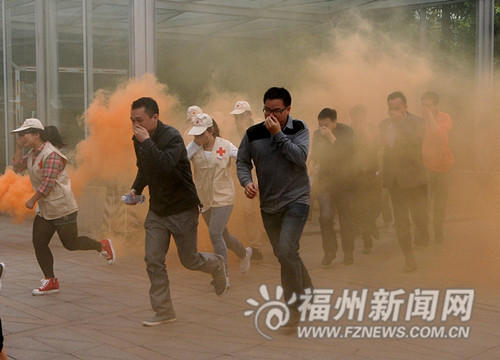 在省电力大厦举行的4.21防空防灾疏散演练,市民参加疏散演练。