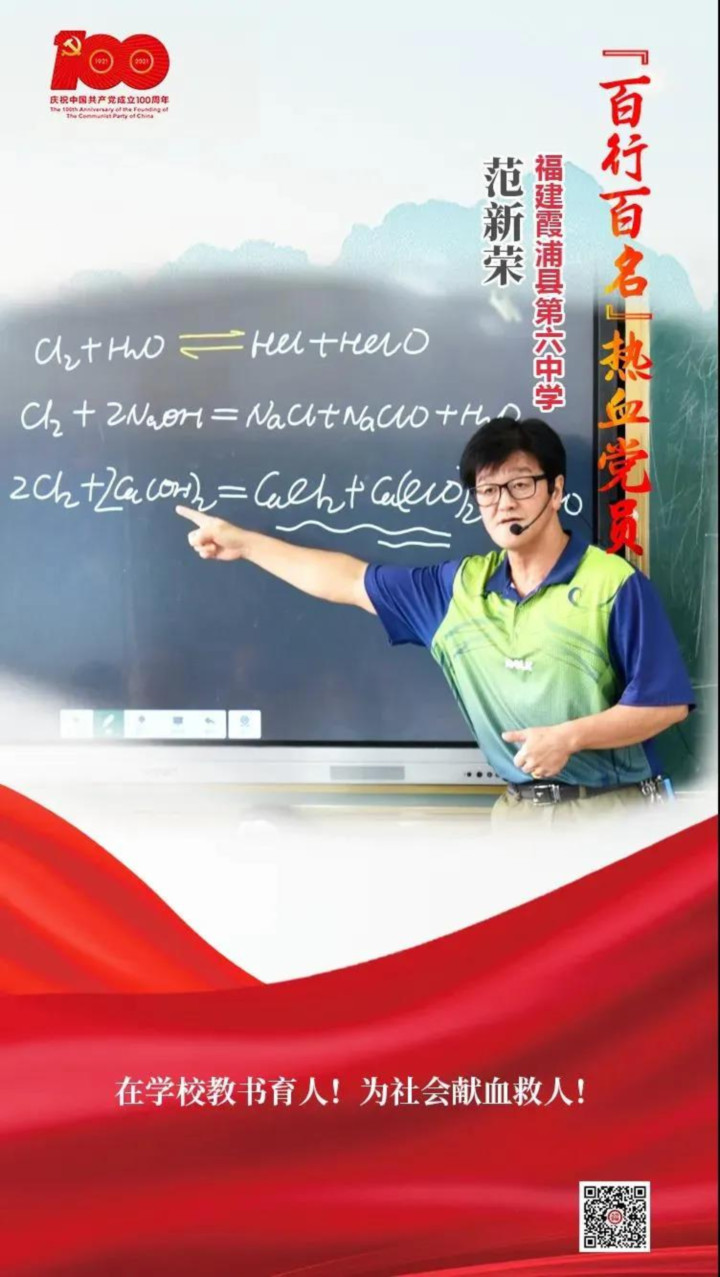 范新荣,霞浦六中教师,从教40年,是一名稀有血型的献血者。作为一名党员教师,在教学工作中一丝不苟,任劳任怨。自18年前加入献血者的行列,截至2021年7月已经献血达6000毫升,曾3次为待产孕妇献血。2021年荣获福建省“百行百名”热血党员荣誉称号。