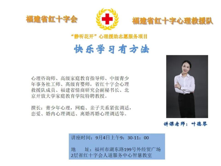 9月4日9:30—11:00,高级家庭教育指导师、福建省红十字心理救援队成员叶德琴老师将用专业的知识,帮助家长解决家庭教育中存在的困惑,提升教育能力,改善家庭教育中的亲子关系,让孩子掌握快乐学习密码,欢迎大家报名。