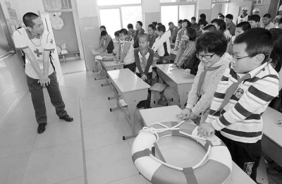 本报讯 (记者 张颖/文 周明太/图)26日,福州市钱塘小学五年(7)班的教室里,省红十字会水上救生志愿服务总队的4名志愿者们以一部人的一生,急救无所不在的小影片拉开了安全教育课的序幕。大家在生活中应该都有擦伤、摔伤的经历,该怎么处理得当呢?我给大家介绍几种急救方法,我们称为‘救命三招’。魏勇生队长的一番话引起了孩子们的极大兴趣。