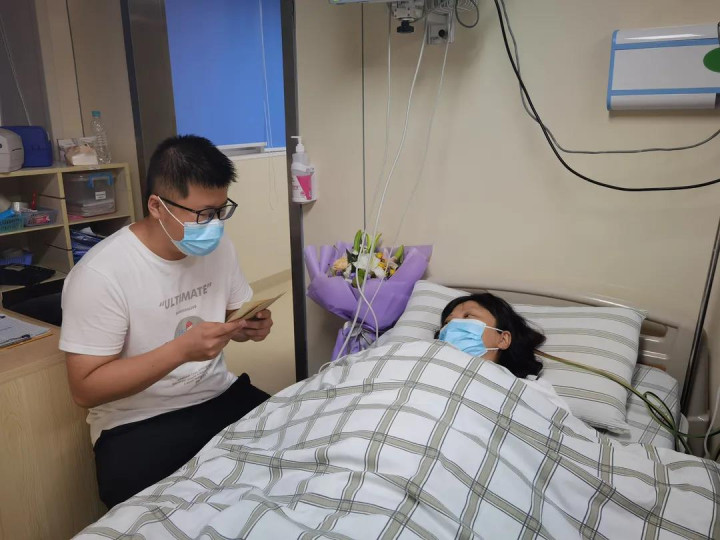 将于第二天捐献造血干细胞的李芳池为吴少红朗读患者感谢信