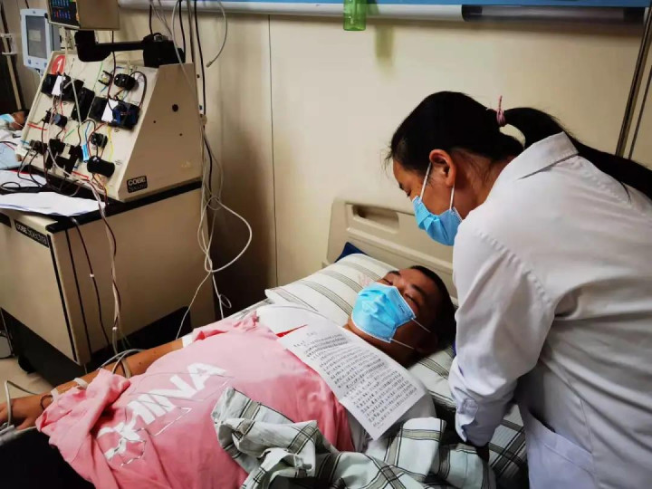 27日上午,在采集时,将于第二天捐献造血干细胞的志愿者李芳池也来到医院,了解采集的流程,同时也为两位正在捐献的志愿者加油打气,还为吴少红朗读了患者写的感谢信。
