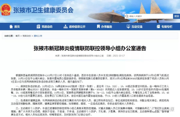 甘肃张掖市新冠肺炎疫情联防联控领导小组办公室17日下午发布通告,该两例病例于10月9日乘飞机抵达张掖,10月10日在平山湖大峡谷、张掖丹霞地质公园旅游参观。对10月9日乘坐MU9649次航班在张掖下机的人员和10月9日至10日与该两例病例在张活动轨迹有交集的人员,提示通告如下: