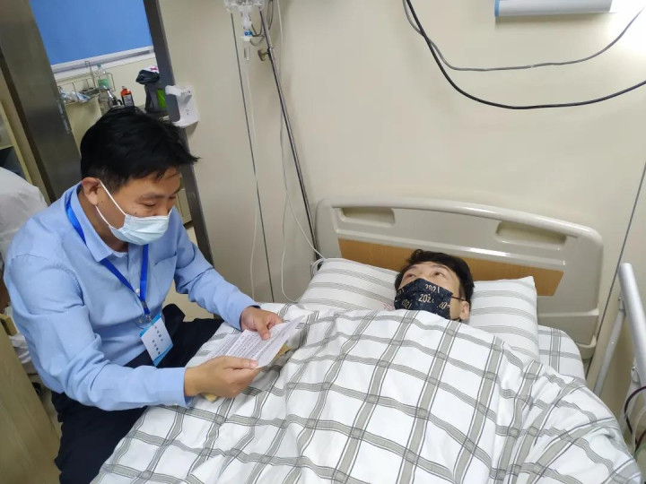 省造血干细胞捐献者资料库管理中心主任敖志雄(左)为刘宏(右)朗读患者感谢信