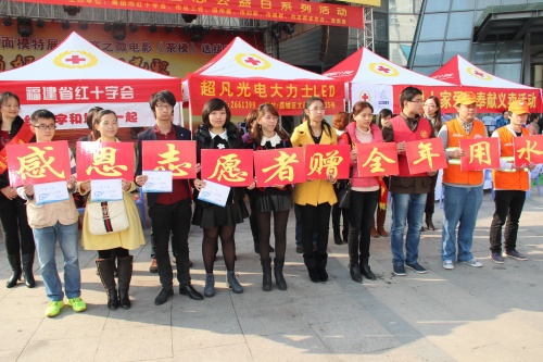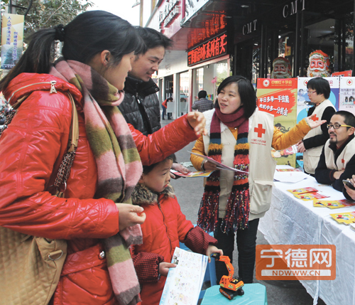 宁德市红十字会:2013年12月31日,由宁德市红十字会、中心血站共同举办的宁德市爱心公益日活动在蕉城区南门爱心献血屋举行。活动以行一个善举,献一份爱心;温暖他人,提升自己为主题,现场20多名志愿者通过向市民分发防灾减灾知识、无偿献血和造血干细胞捐献宣传材料、展示现场应急救护技能等方式,向大众传播爱心公益理念。