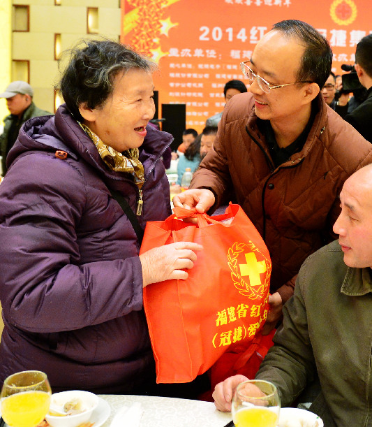 当日是农历小年,由福建省红十字会和社会爱心企业共同举办的2014红十字爱心年夜饭慈善活动在福州举行,1千名孤寡老人、孤儿等社会困难群体相聚一堂,提前品尝温馨的年夜饭。此外,每位特困人员还获得1份价值200余元的爱心年货大礼包。