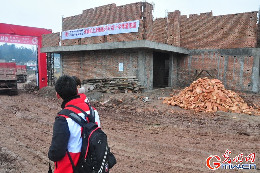 一名中国红十字会工作人员走过雅安雨城区上里镇庙圷村红十字博爱家园施工现场。光明网记者张薇/摄