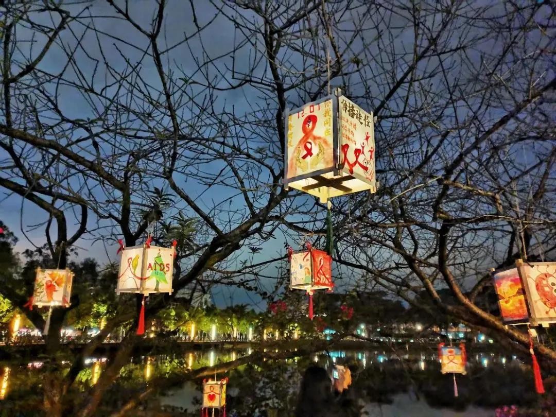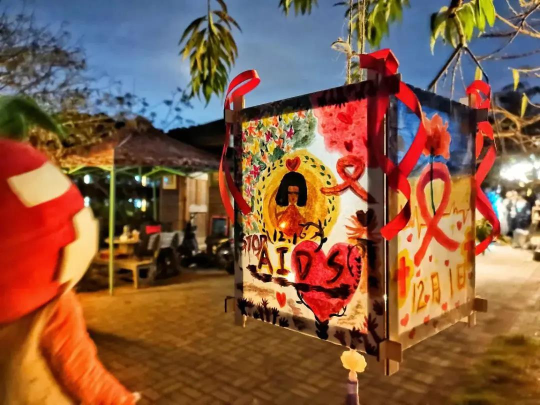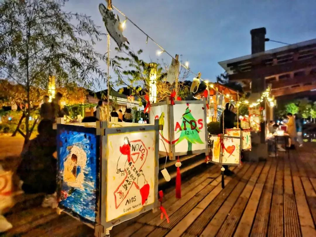 在夜色中显得格外美丽那是福建农林大学的同学们挥洒着五彩缤纷的颜料将心中所想描绘在空白的灯笼用心中所爱温暖艾滋病人的内心
