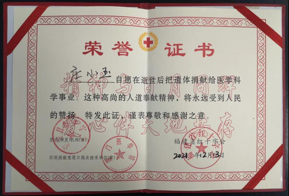 庄小玉去世之后,家属在悲痛之余联系县红十字会,县红十字会工作人员当天陪同厦门医学院工作人员到家中,帮助他完成了遗愿,捐献遗体给厦门医学院做医学研究,支持医学事业发展,为社会做出最后的贡献。