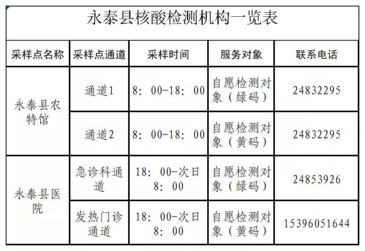 永泰县核酸检测机构一览表