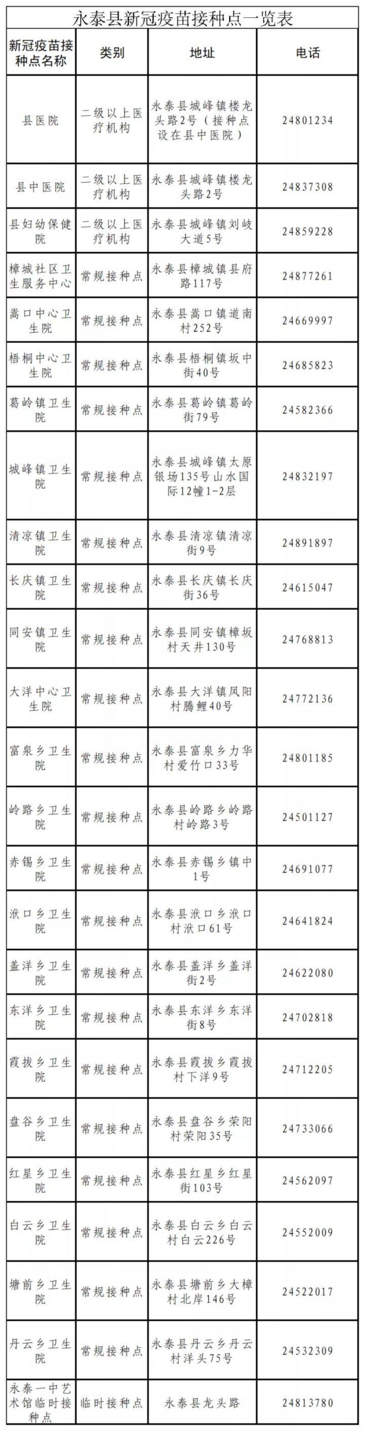 永泰县新冠疫苗接种点一览表
