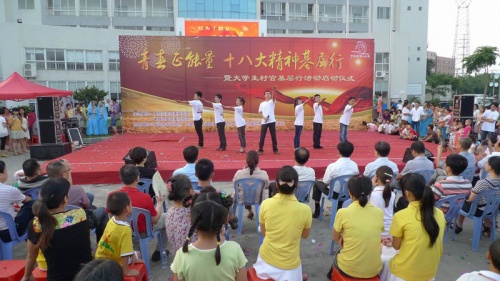 6月26日下午,厦门市同安区红十字会借力青春正能量,十八大精神基层行暨大学生村官基层巡演活动,在新民镇梧侣社区开展红十字知识宣传活动。大学生村官们用自编自演的快板等群众喜闻乐见的形式,向居民宣传红十字精神和基本知识,向现场观看演出的1000多名群众发放防灾避险、遗体器官捐献等宣传材料。此次巡演活动历时半个月,将在全区8个村(居)进行。 (厦门市同安区红十字会)