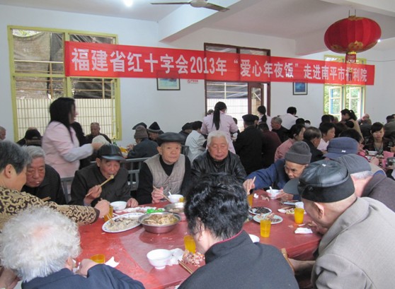 2月4日,省红十字会2013年爱心年夜饭走进南平活动在南平市福利院、市麻风村、宁康医院、浦城县福利院、光泽县福利院同时举行。此次活动为无依无靠的302名孤寡老人、孤儿、三无精神病患者、麻风病人等特困群体除旧岁、迎新春,市红十字会常务副会长杨丽萍及红十字志愿者与孤老、孤儿欢聚一堂,共品爱心年夜饭,欢欢喜喜过大年,并将爱心年货大礼包送到每位孤老、孤儿手中,让他们感受到来自社会大家庭的爱心与祝福。