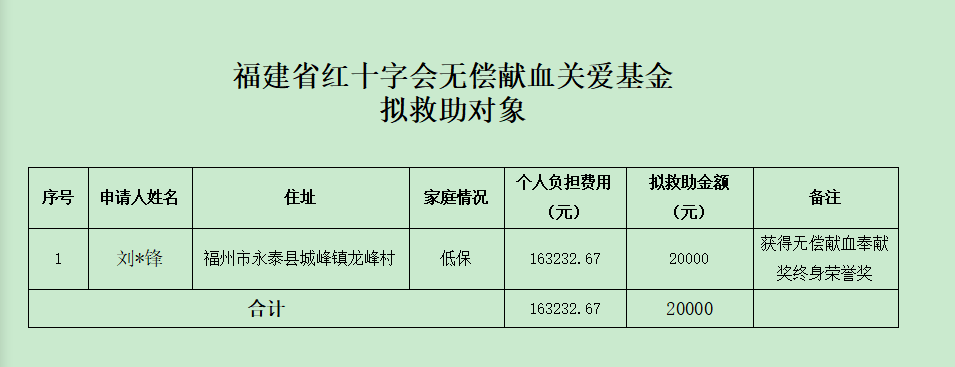 根据《福建省红十字会无偿献血关爱基金管理办法(试行)》规定,现对拟获得福建省红十字会无偿献血关爱基金救助的刘*锋予以公示,公示期5个工作日(2025年9月10日-2025年9月16日)。