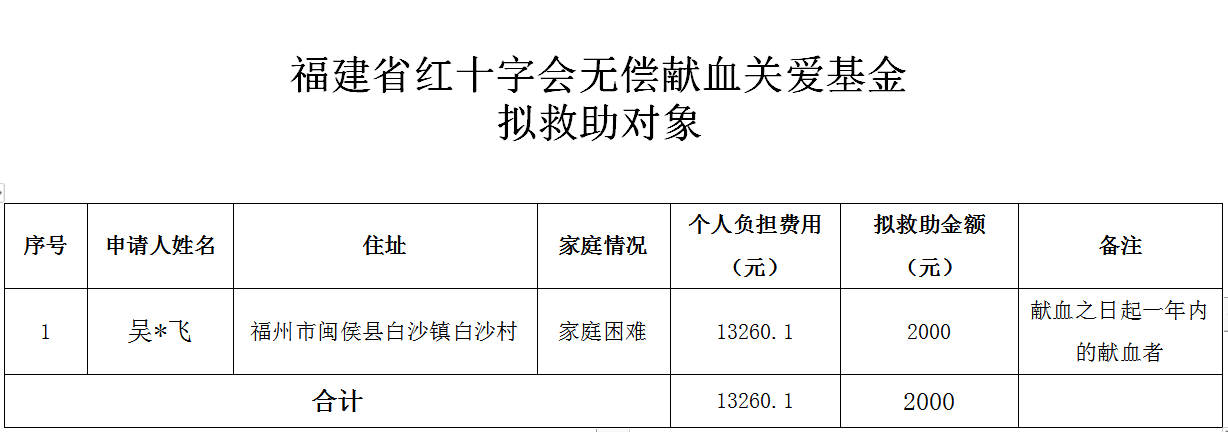 福建省红十字会无偿献血关爱基金拟救助名单公示