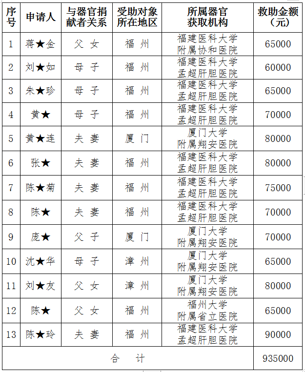2025年11月1日至11月30日,省红十字会受理人体器官捐献者家庭困难人道救助申请13例,实施救助13例,发放救助款共计93.5万元整。现将具体名单公布如下: