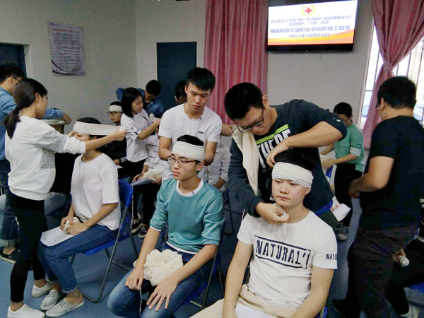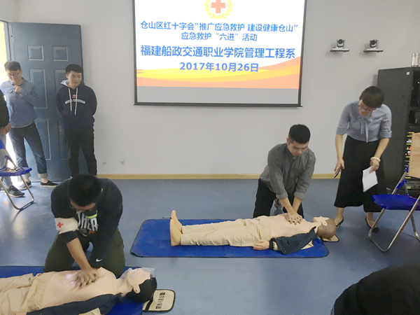 10月26日,仓山区红十字应急救护志愿服务队走进船政学院,为管理工程系的五十余名学生进行应急救护培训。结合互动式教学,志愿者老师现场讲解示范具体的操作过程,通过PPT和实体示范,教授心肺复苏术和基本伤口包扎。理论学习之后进行实践操作与情景演练,同学们现场演习遭遇心肺复苏救护过程,由专业老师从旁指导点评。