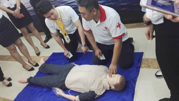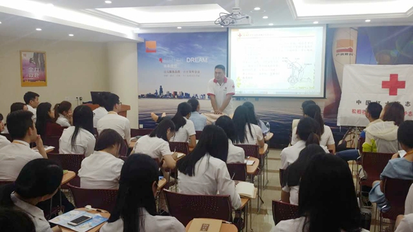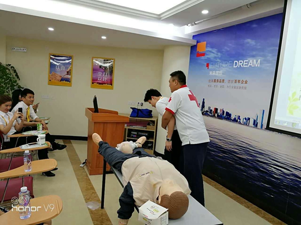 2017年5月19日,思明区嘉莲街道松柏社区红十字会邀请思明区红十字应急救护师资吴飚讲师于辖区企业丹厦房产总部开展红十字应急救护知识培训。丹厦房产员工及松柏社区红十字志愿者共50余人参与本次培训。本次培训以讲授心肺复苏及气道梗阻应急处置等应急救护知识为重点,以动手实操为主,同时结合授课、研讨等方式进行。课上吴飚讲师悉心指导参与人员在模拟人上进行模拟应急救护操作,现场互动氛围良好。课后参与人员均表示受益良多,通过本次培训学习了许多必要的应急救护的知识。