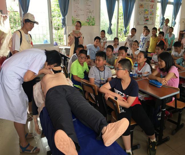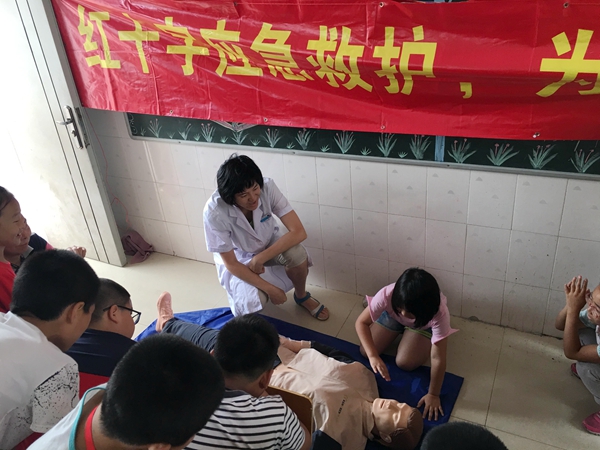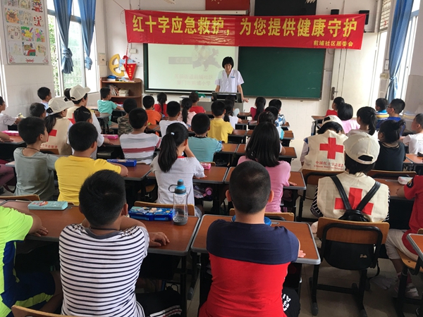 为了进一步普及急救知识和技能,思明区前埔社区于2017年5月23日在前埔小学四年二班班级开展应急救护技能培训活动,由莲前卫生院王惠君医师主讲,40位小学生以及8位红十字志愿者参与此次活动。王医生此次主要着重讲解心肺复苏的应急救护知识。教导小学生如何判断反应、摆放体位、胸外按压以及人工呼吸。老师的讲解通俗易懂,着重通过与学生的互动,指出存在的错误方法及误区,让小学生们能更好的进行正确操作。