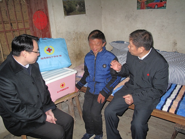 ▲省红十字会秘书长张建林(右一)专程前往墨鱼头男孩池周晶家中慰问,详细了解他术后恢复情况,送上红十字人道关怀,鼓励他好好生活
