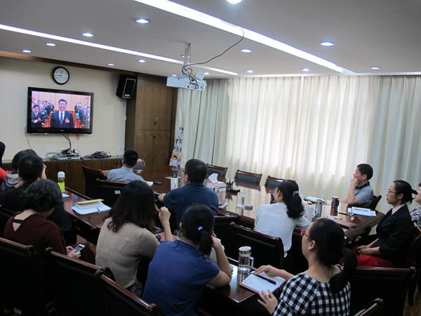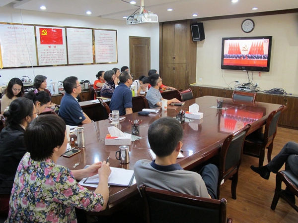 上午8时50分,会机关、直属事业单位干部职工提前在会机关八层会议室集中,等候观看十九大开幕盛况,每个人都沉浸在喜迎十九大胜利召开的浓厚氛围里。9时整,集中收看的干部职工聚精会神聆听习近平同志代表中国共产党第十八届中央委员会向大会所作的报告,并认真记录报告的有关内容。