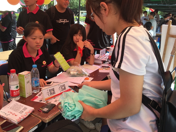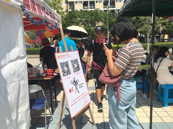 这也是福建省红十字会联合福州大学红十字会开展的2017年秋季开学纳新季·‘福建人道传播’微信公众订阅号宣传推广活动走进福州大学线下活动,现场设有福建人道传播微信公众号二维码,现场扫码关注公众号,即可获得精美小礼品。
