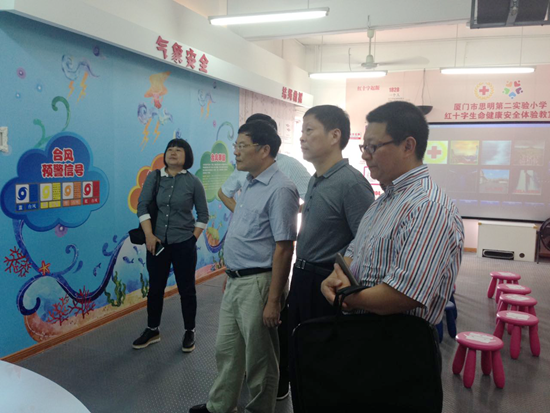 18日上午,考察组一行在厦门市、思明区红十字会工作人员陪同下, 来到思明区第二实验小学参观红十字生命健康安全体验教室,详细了解体验教室生命认知、教室校园安全、地震、电梯安全、逃生通道、气象安全、结绳救援、交通安全等11个体验式生命教育模块的设置和教学模式。