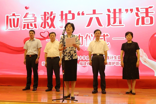 李红会长在致辞中指出,开展应急救护六进活动,面向广大人民群众,推广应急救护知识,掌握自救互救技能,是促进全民救护网络构建,推动健康福建建设的一项重要举措和民生工程。我省地处海峡西岸,每年台风、洪涝等自然灾害多发,还有各类的意外事故等,都给人民群众造成重大损害,甚至危及生命健康。从救援工作的实践看,突发事件发生后,人们在第一时间会不会自救互救,是最大限度减少人员伤亡的关键因素。加强应急救护基本知识和技能的普及培训,有利于及时有效挽救生命,减少灾害事故二次伤害,促进和谐社会构建。希望各级各有关部门站在协调推进四个全面战略布局的高度,从加强社会治理、促进健康福建建设的现实需要出发,把开展应急救护培训作为关爱群众生命、保护群众安全的民生工程摆上重要位置,进一步提高思想认识,采取有力措施,共同做好这项工作,为保护人的生命健康,为再上新台阶、建设新福建做出应有贡献。
