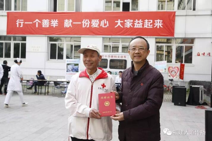 一名穿着红十字外套的老者,在年轻的红十字志愿者中特别显眼。老人叫高永华,今年74岁。说到高永华,大家都很熟悉,他此前因单骑走遍全国宣传无偿献血,近百次献血,成为2003年感动福建年度人物。活动现场,高永华更是捐出了2000元钱。