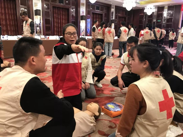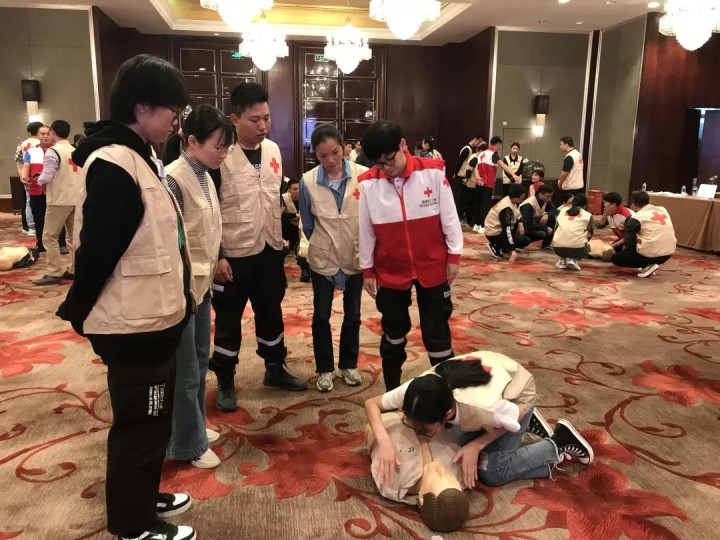 为了确保每位红十字救护员的胸外心脏按压和人工呼吸技术操作规范、细节到位,培训班依照国际新标准的心肺复苏操作流程,利用仿真模拟人模拟现场救护心跳呼吸骤停的伤病员,组织红十字救护员从判断意识反应、呼救、胸外按压,到排除口腔异物、人工呼吸及AED应用等各个环节反复进行模拟操作;设置多种现场突发情况,组织红十字救护员进行处置演练。并通过考核选拔113名志愿者参加赛事的应急救护保障。