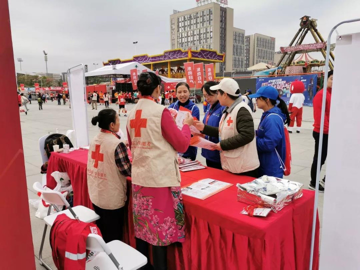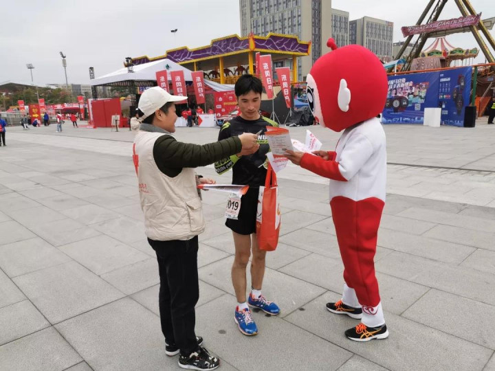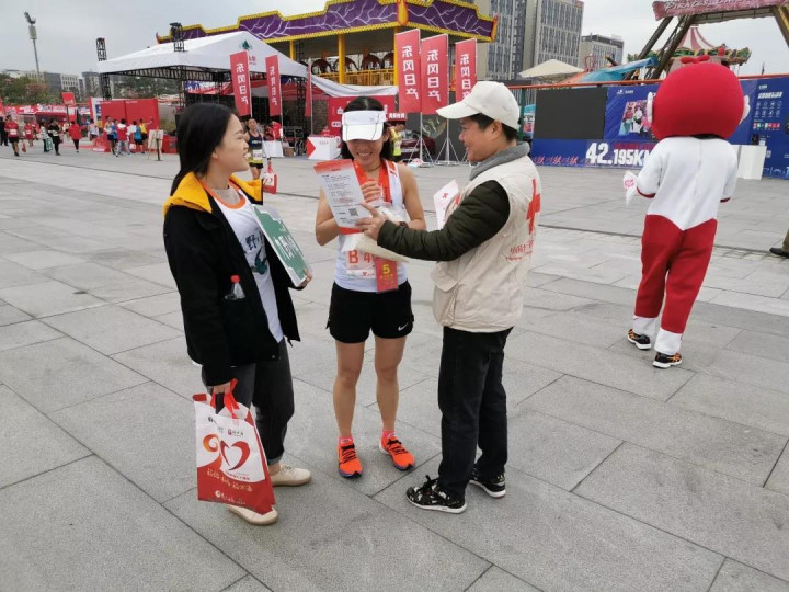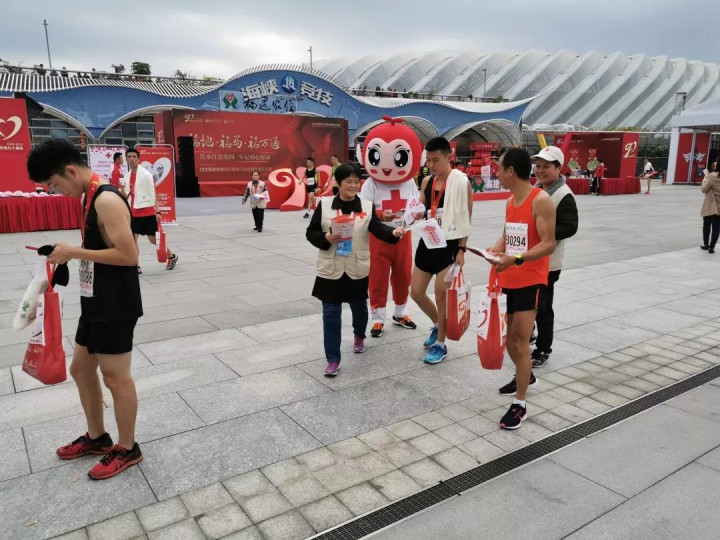 志愿者们为参赛者分发“红博娃”毛绒公仔、摆手旗、钥匙扣等宣传品,利用宣传海报、宣传折页宣传省红十字会与省农信联社共同发起的红十字福万通少儿重特大疾病医疗人道救助基金,引起了不少爱心人士的关注。