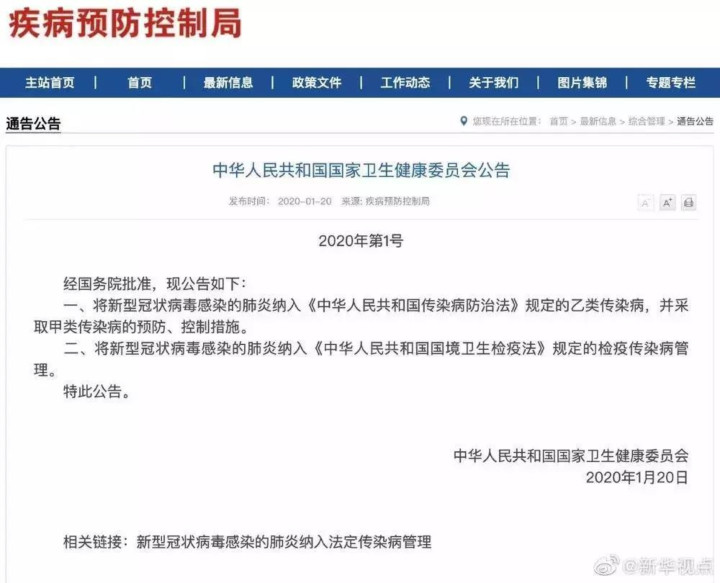 国家卫健委发布1号公告,将新型冠状病毒感染的肺炎纳入《中华人民共和国传染病防治法》规定的乙类传染病,并采取甲类传染病的预防、控制措施。将新型冠状病毒感染的肺炎纳入《中华人民共和国国境卫生检疫法》规定的检疫传染病管理。