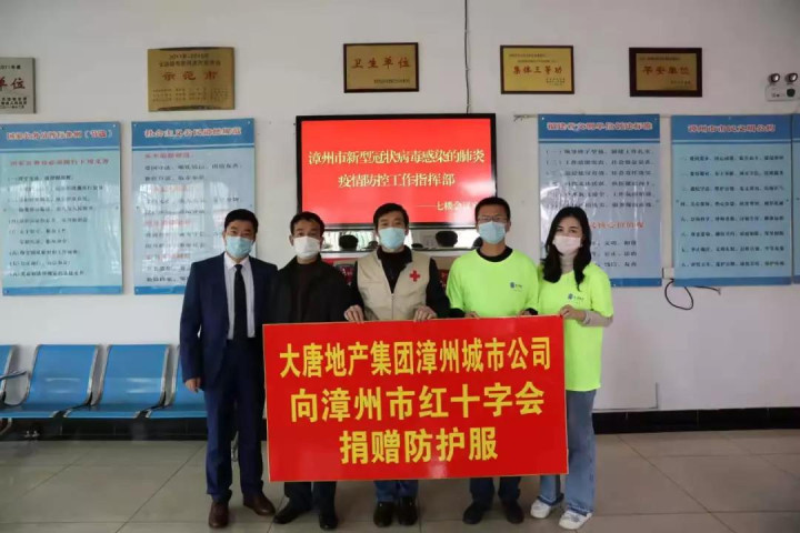 2月4日,大唐地产集团漳州城市公司向漳州市红十字会捐赠480套防护服。随即,该批物资移交市疫情防控指挥部医疗物资保障组,并拨给漳州市医院一线防疫人员使用。同日,福建省博兴建设公司捐赠3000个一次性防护口罩,也已投入防疫一线。
