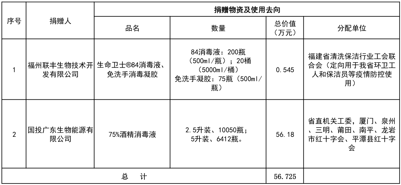 共接收N95口罩5560个、普通口罩124422个、手套21400只、防护服4192件、护目170副、防护帽3000个、鞋套11700个、电子测温仪4个,交由省疫情防控工作领导小组统筹调配。