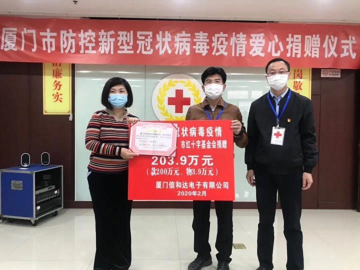 为支援厦门援鄂医疗队,厦门信和达电子有限公司通过厦门市红十字会、市红十字基金会捐款200万。另外,捐赠了价值3.9万元医疗物资支援基层一线疫情防控。企业代表表示,希望通过捐赠善款,表达对援鄂医疗队的关爱和支持。厦门信和达电子有限公司成立至今,已通过市红十字会捐款1000多万元款物,用于援建希望小学和资助贫困学生,还分别在甘肃宕昌县、宁夏海源县和泾源县及福建长汀县、周宁县各捐建了1所希望小学。